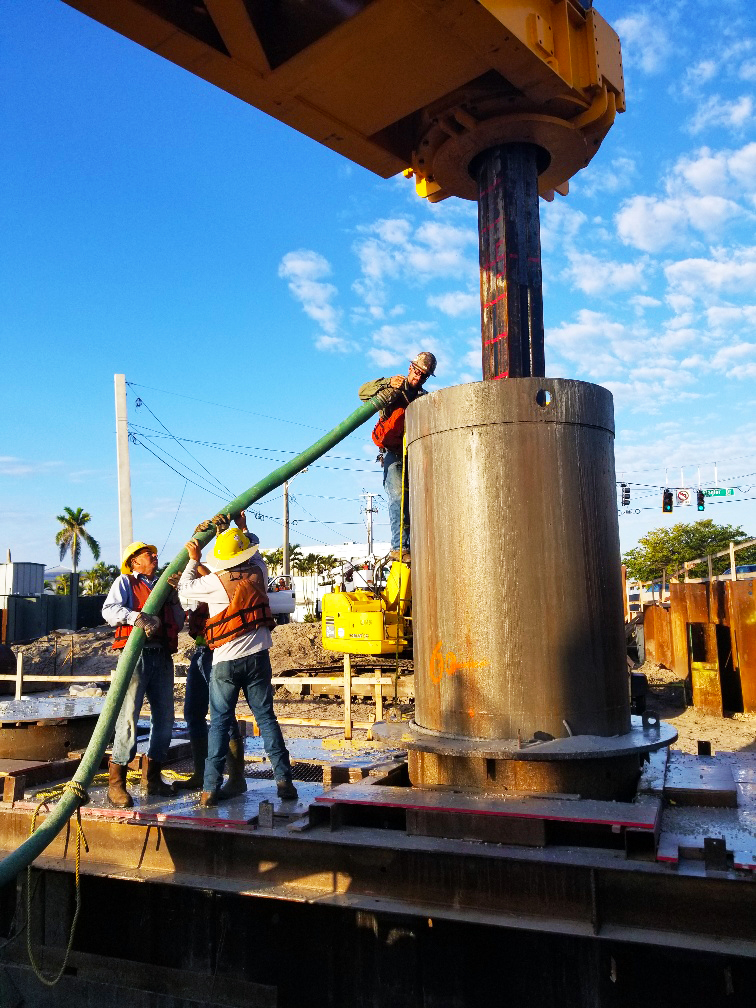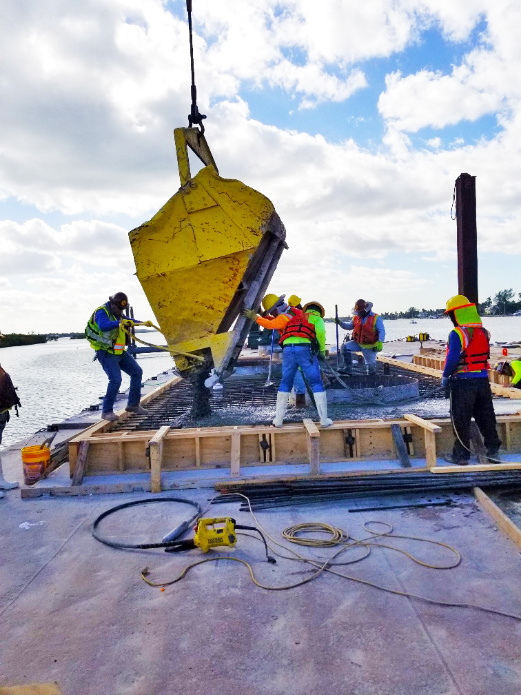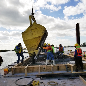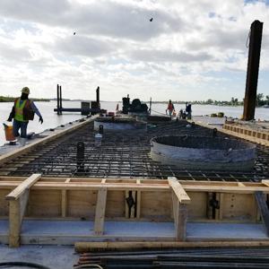 Concrete is poured to create a seal slab foundation for a bascule pier. December 2018