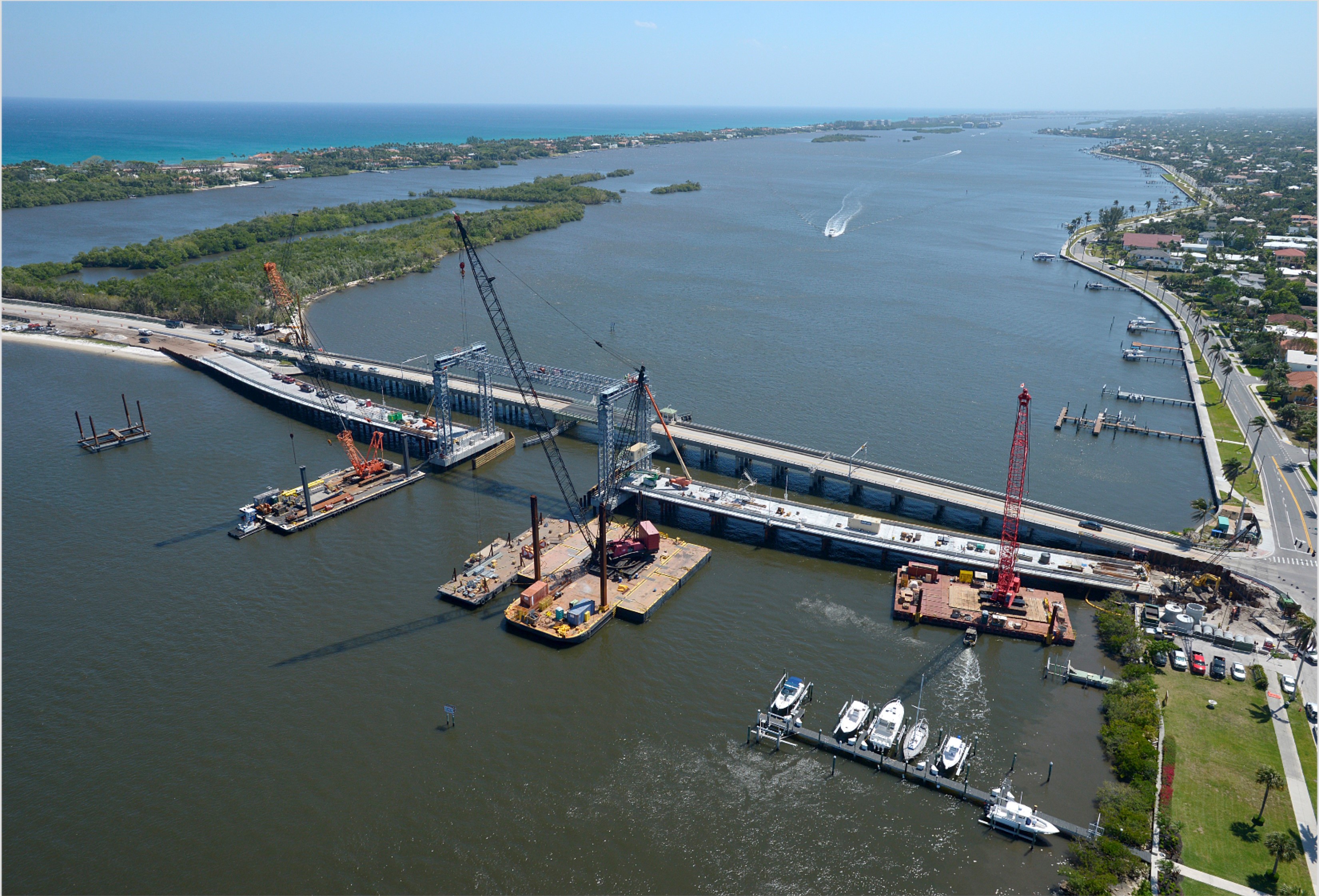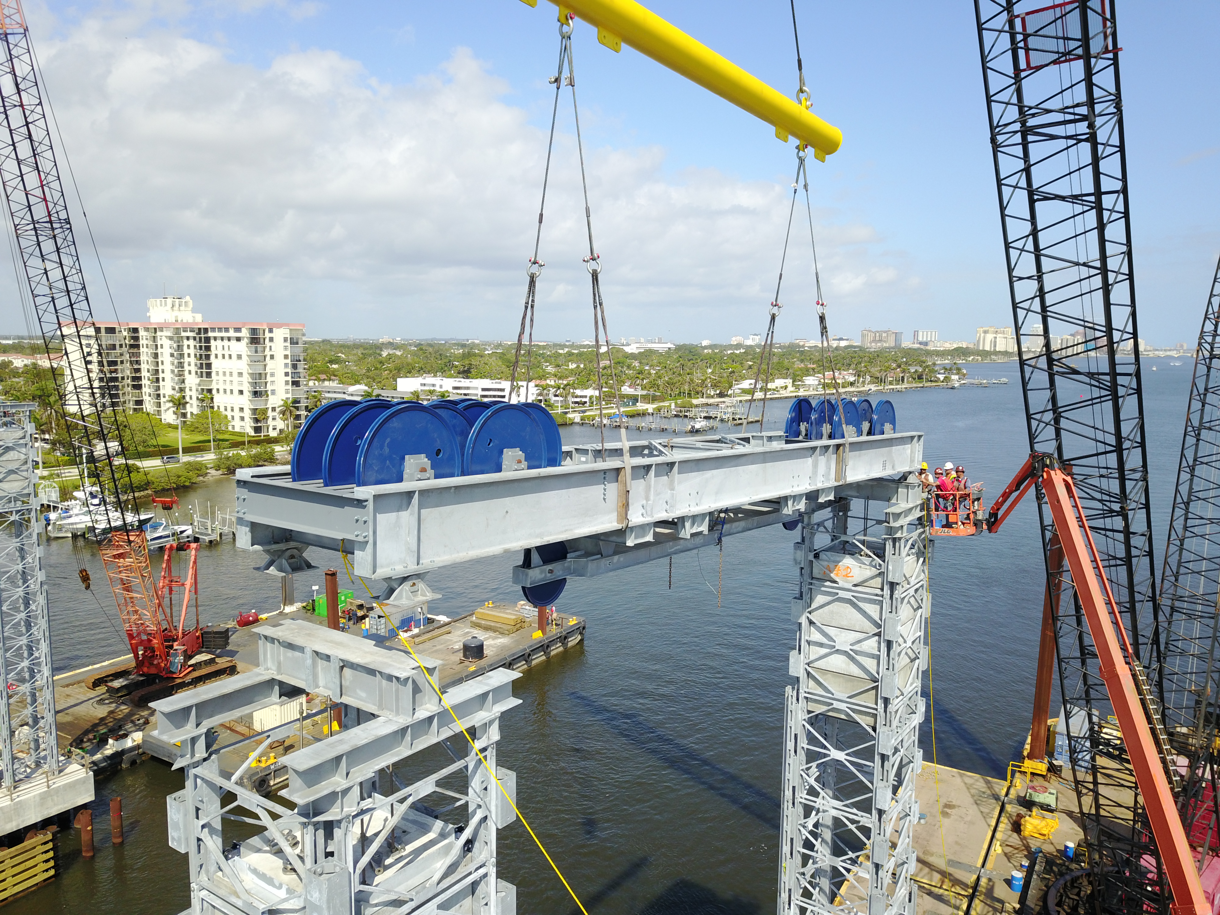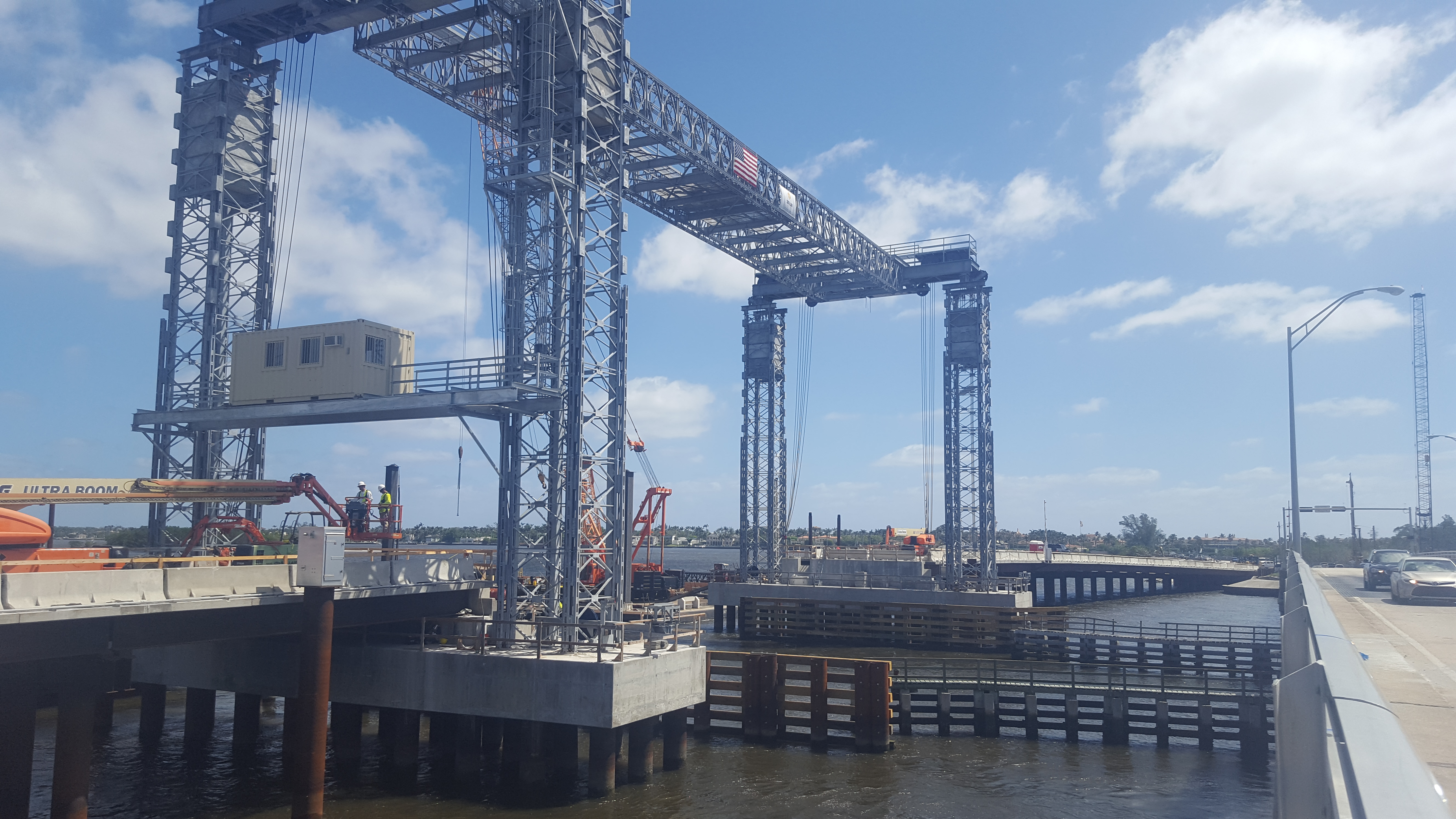 The temporary bridge’s vertical lift span rises above the Intracoastal Waterway. March 2018