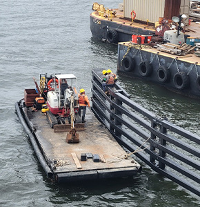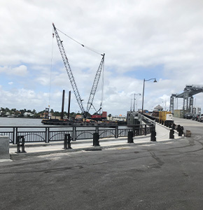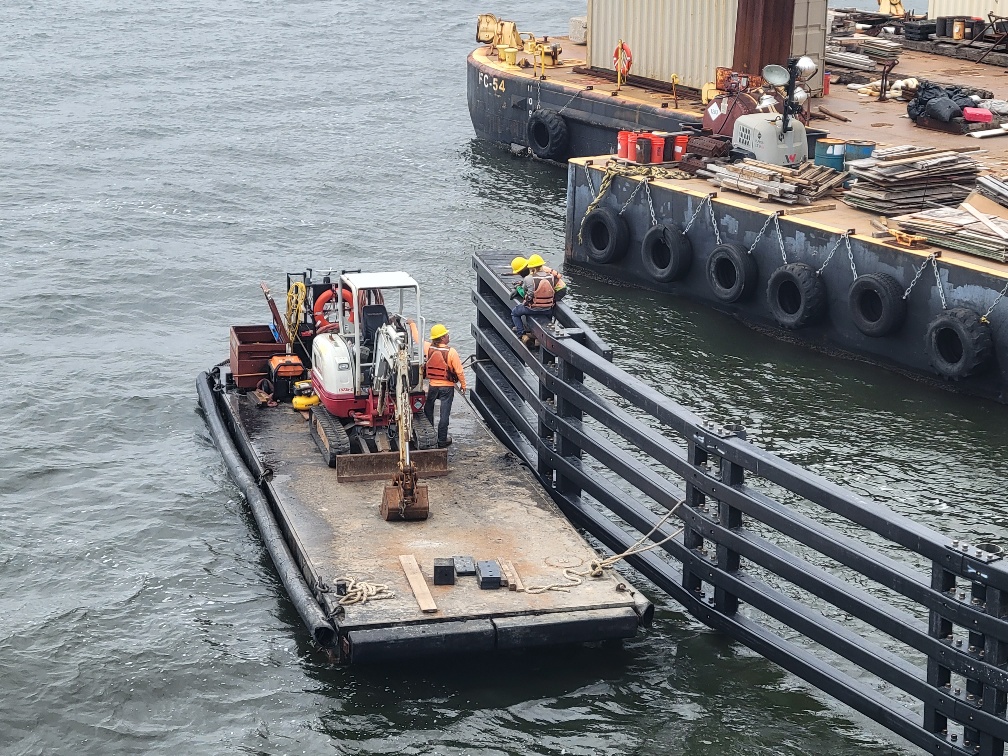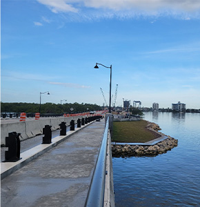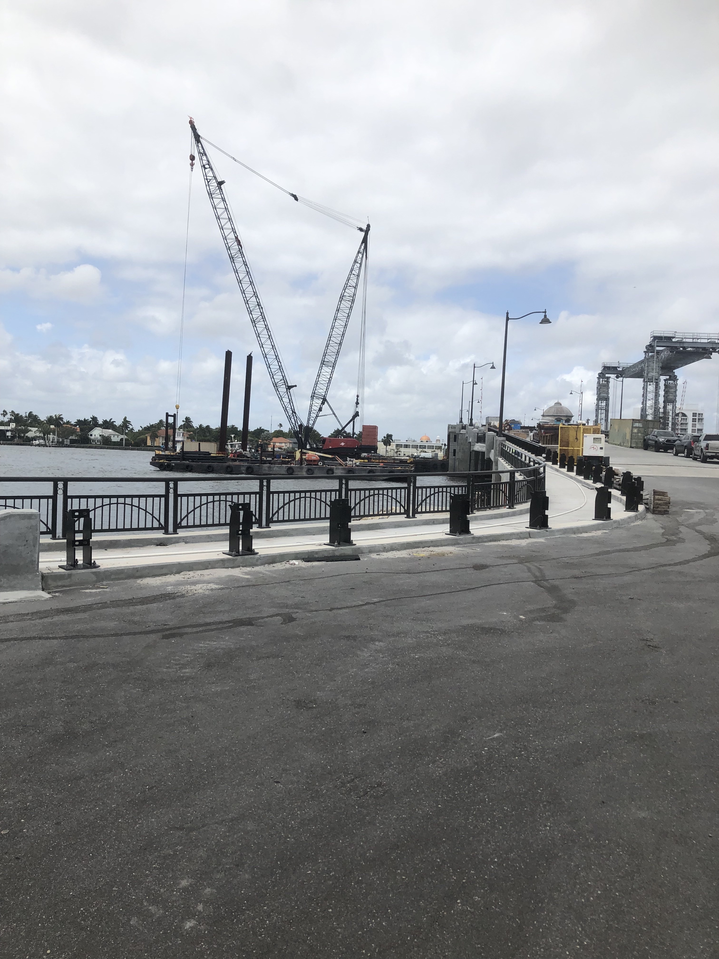 New traffic railing is installed on the bascule bridge’s eastern approach. March 2022