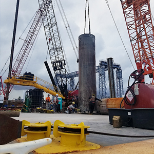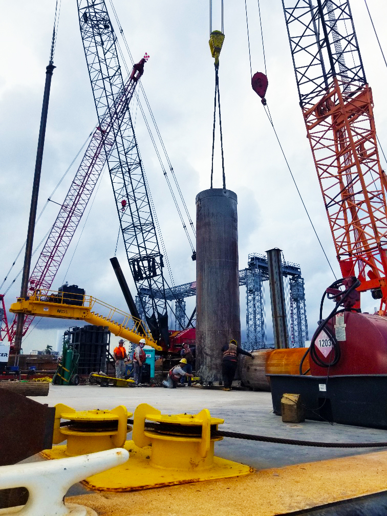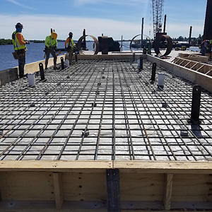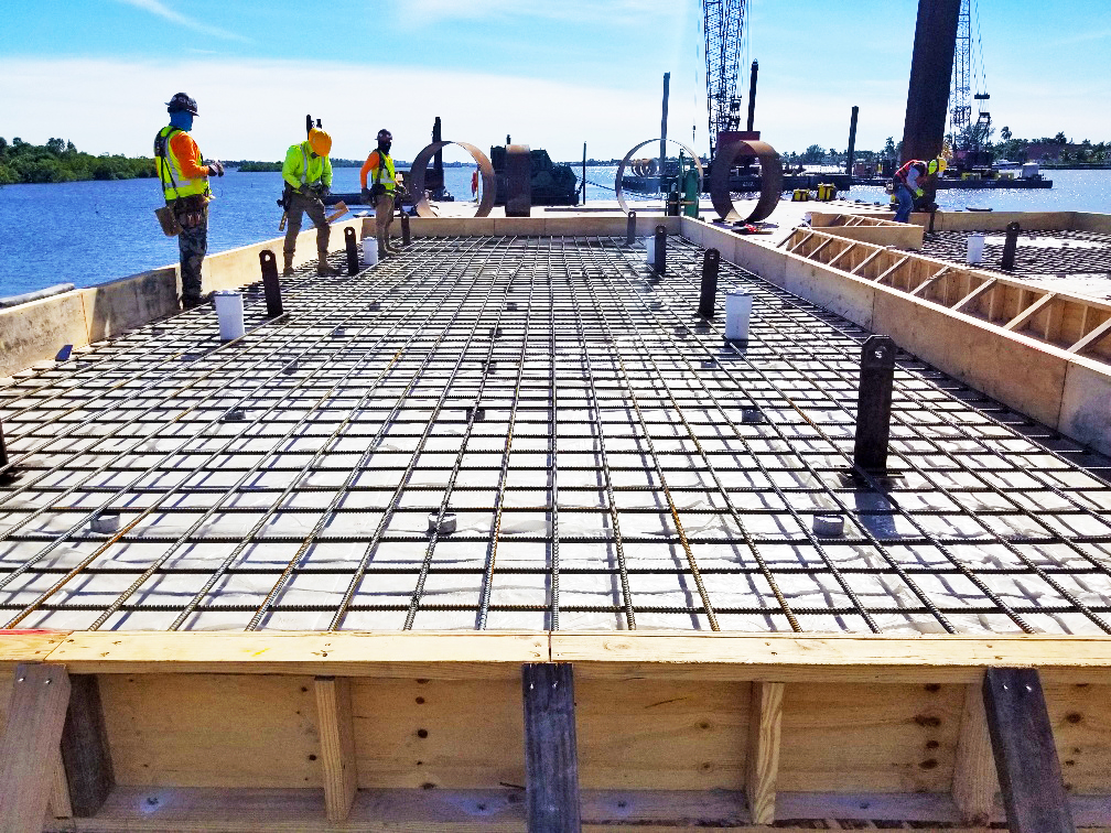 Concrete seal slabs for the bascule piers are formed on barges in the Intracoastal Waterway. November 2018