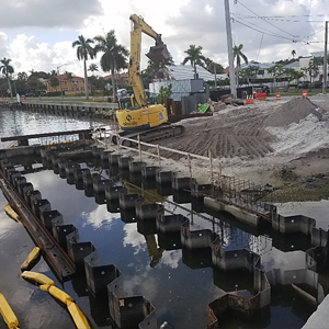 Crews work on prepping the site for the western abutment of the bascule bridge. November 2018